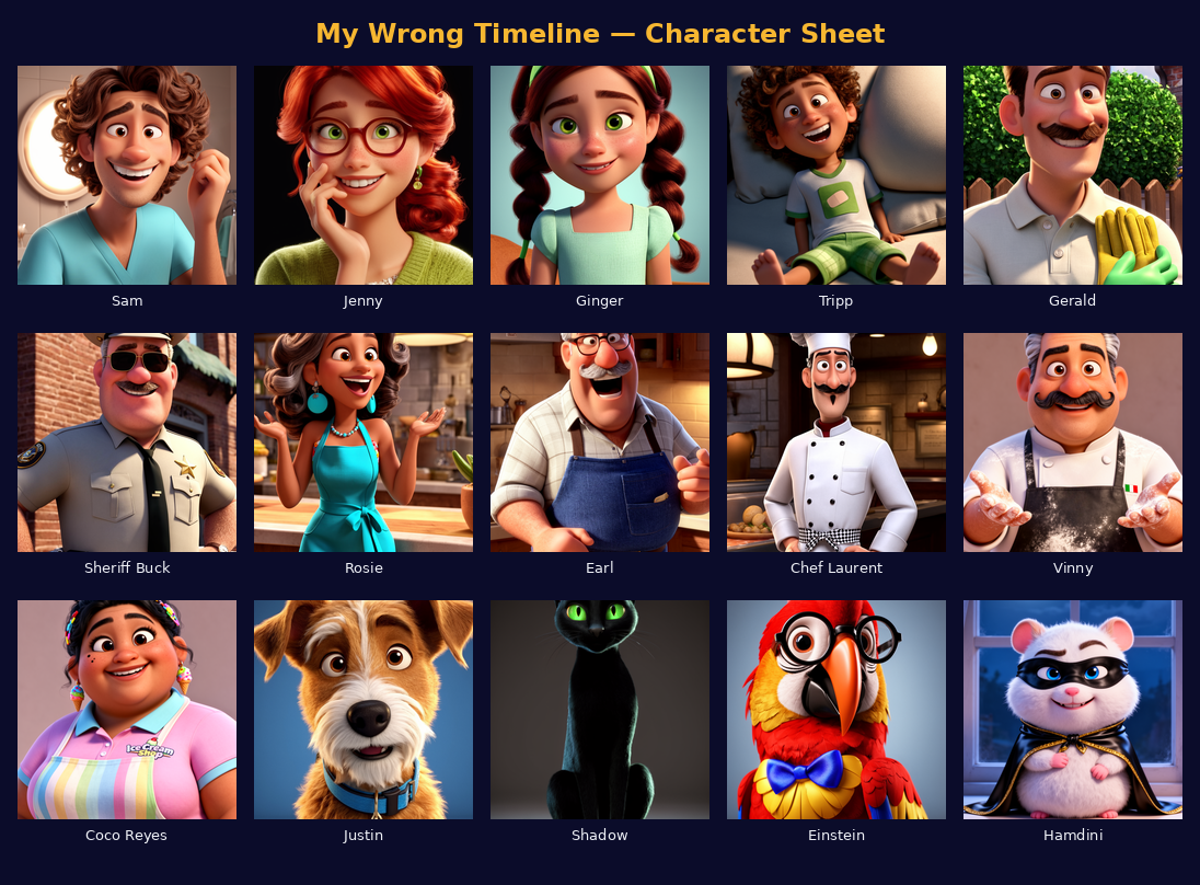 My Wrong Timeline is a Pixar-style animated comedy series about Sam Marvin, a 28-year-old tinkerer who accidentally built a machine in his garage that opens portals to realities nothing like our own. Set in the fictional town of Plainview (population 420, motto: "Nothing to see here"), the show blends small-town ensemble comedy with spectacular interdimensional adventures.